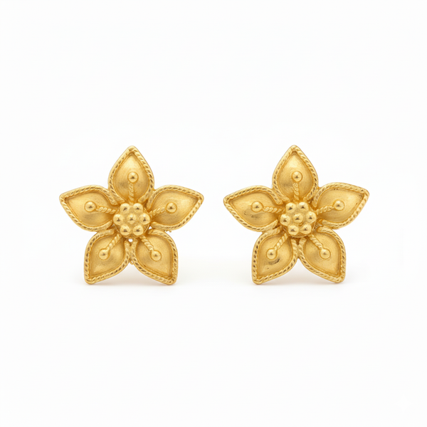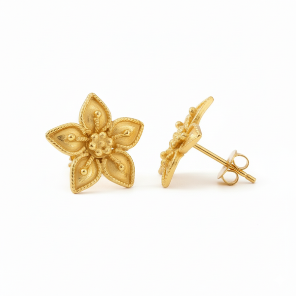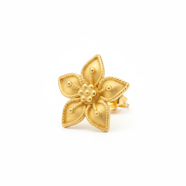 Les boucles d’oreilles Botão de Ouro signées Luzia réinventent l’éclat d’une fleur iconique : le bouton d’or, symbole de lumière et de pureté. Sculptées en acier inoxydable doré, ces petites fleurs à cinq pétales terminés en pointe rappellent les bijoux d’autrefois, comme de véritables “boutons d’or” précieux.