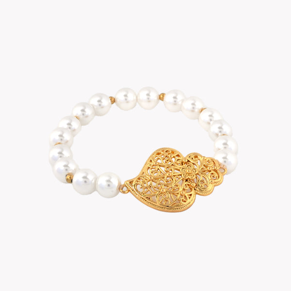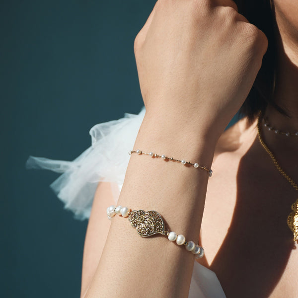 Laissez-vous séduire par la délicatesse de ce bracelet perlé rehaussé d’un charm en filigrane doré représentant le Coração de Viana, symbole de l’amour et de la tradition portugaise.