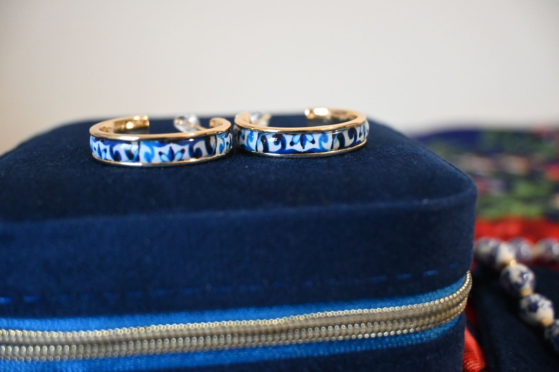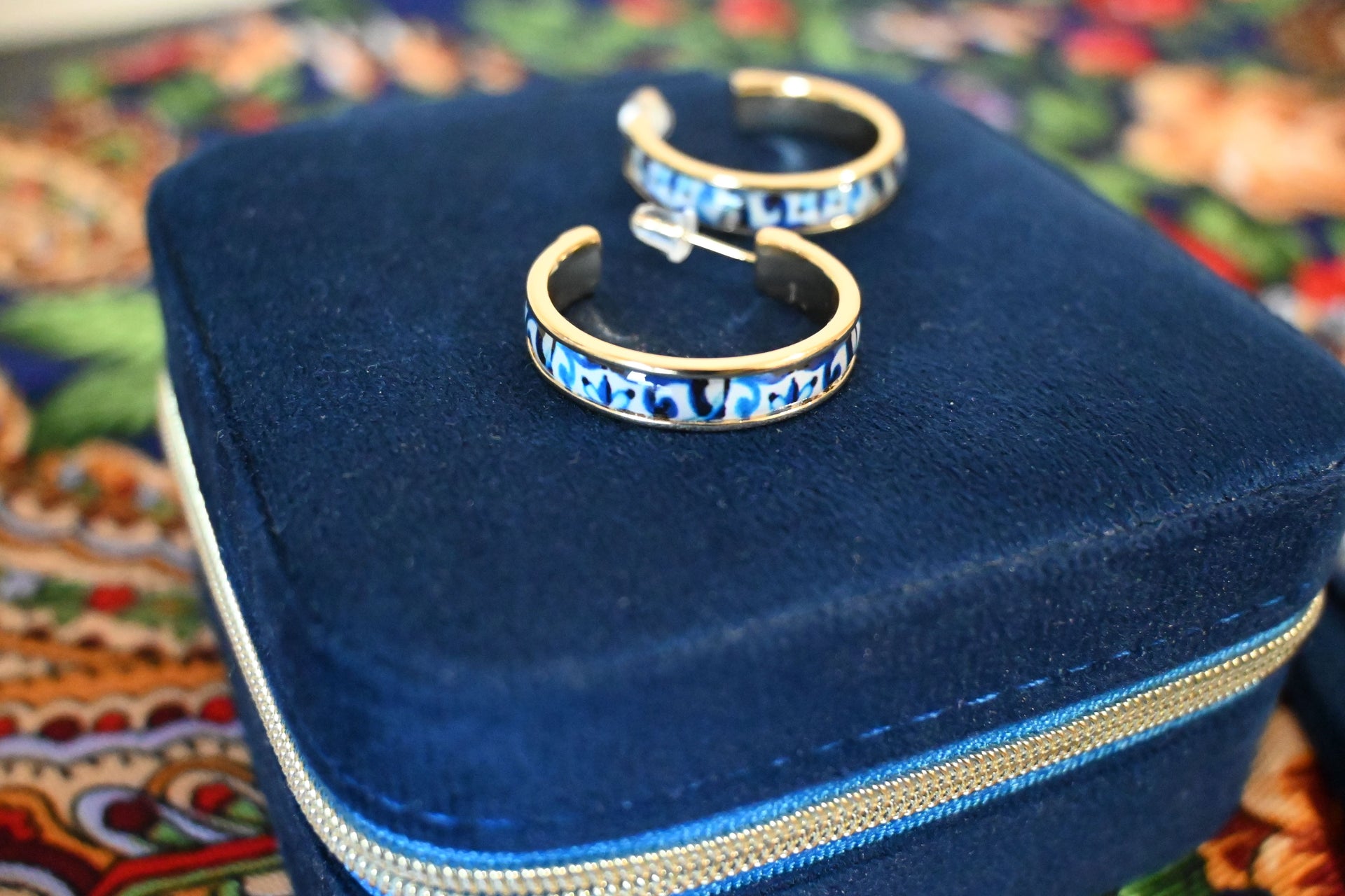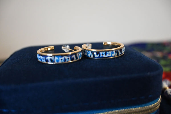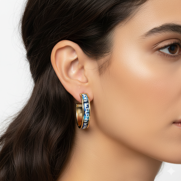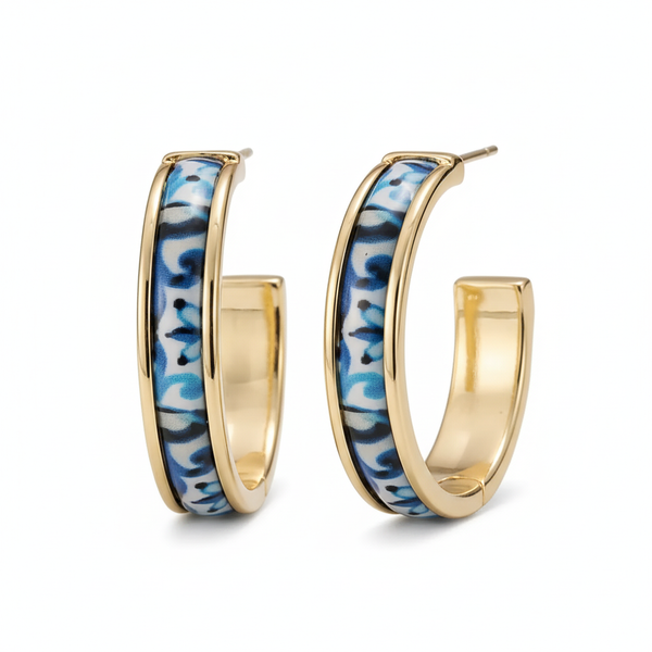 Les boucles Fadoa incarnent l’élégance portugaise dans toute sa subtilité. Inspirées des azulejos traditionnels, elles arborent un motif finement travaillé sur de délicats anneaux dorés en acier inoxydable, formant un 3/4 de cercle au design raffiné.