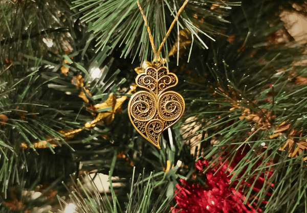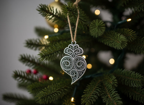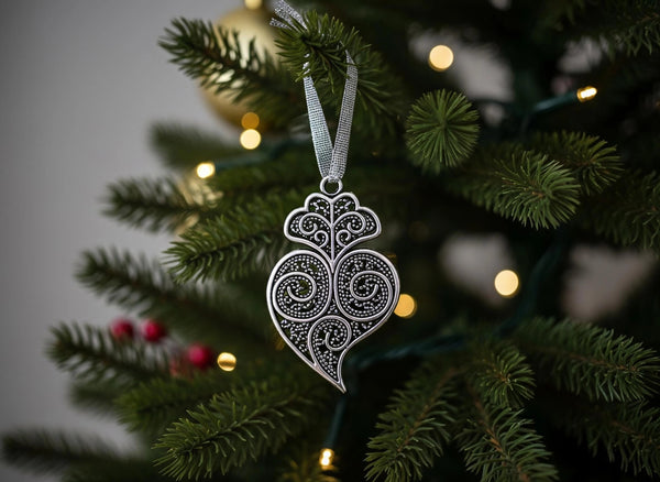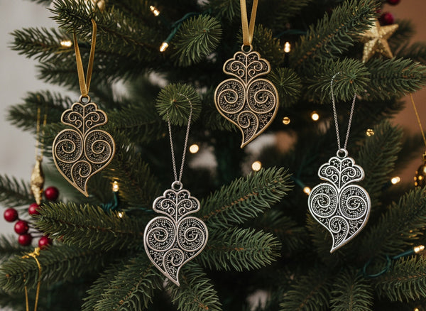 Ajoutez une touche étincelante et portugaise à votre sapin de Noël avec notre magnifique ensemble de 5 décorations de Noël Coração de Viana couleur bronze ou argent. Chaque pièce est finement travaillée en filigrane avec un alliage de zinc de haute qualité, assurant une durabilité exceptionnelle et un éclat éblouissant.