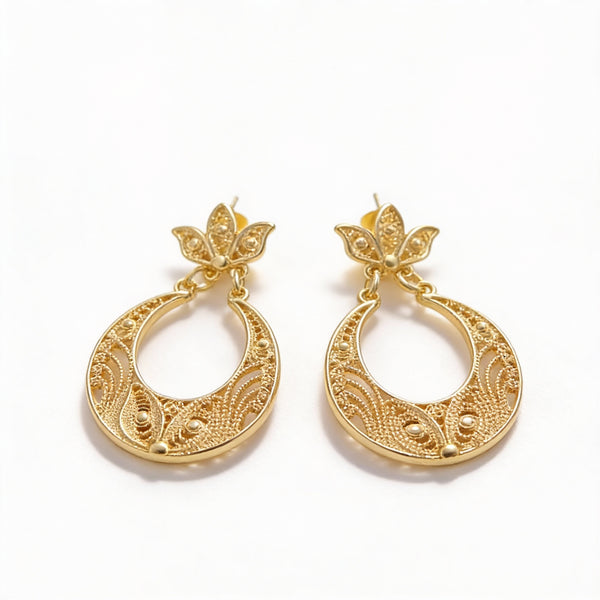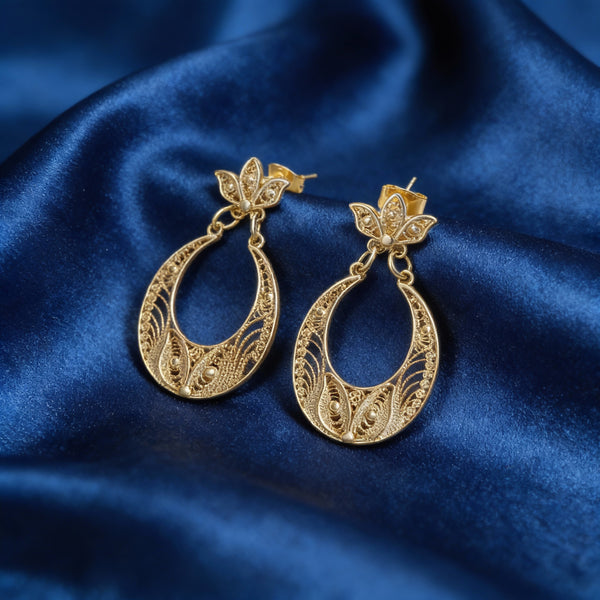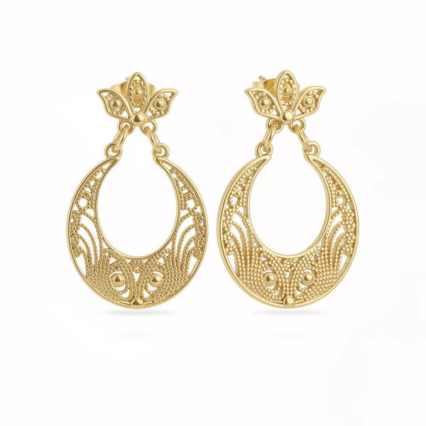 Leur design iconique associe un motif floral au niveau de l’attache, symbole de féminité et de renaissance, à une grande goutte ajourée en filigrane, aussi appelée arcada. Cette forme en arche, finement travaillée, est l’une des signatures les plus nobles de la joaillerie portugaise.