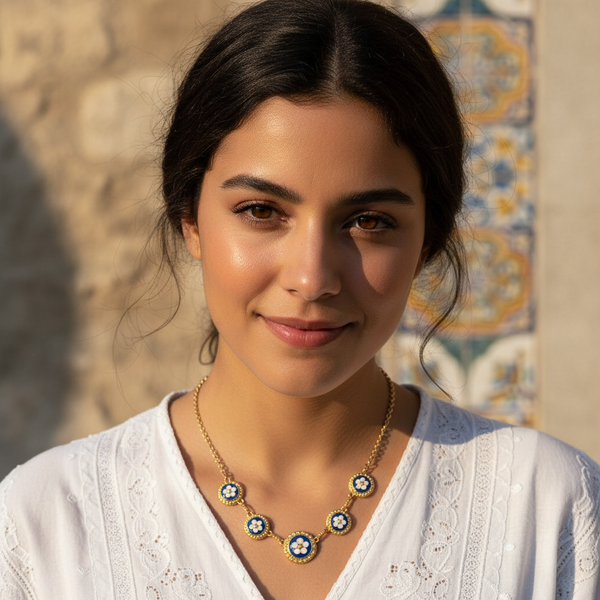 Cette version revisitée par Luzia se compose de cinq pendentifs caramujos plaqués or, délicatement disposés pour créer une ligne harmonieuse, raffinée et lumineuse. Chaque spirale capte la lumière, évoquant la mer, les voyages, et les histoires transmises au fil des générations portugaises.