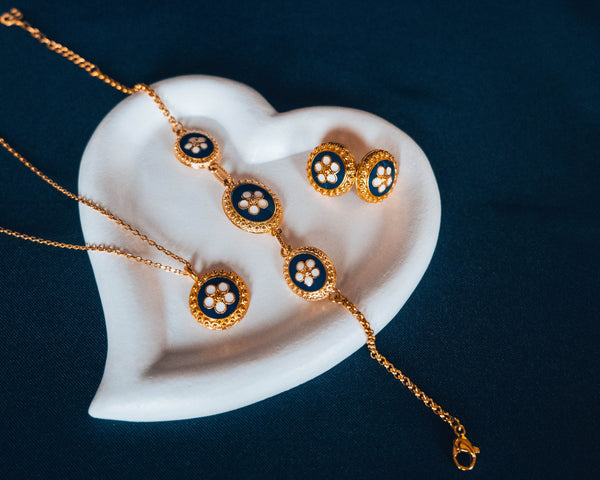 Descubra a elegância e a tradição de Portugal com o conjunto azul Caramujo , que inclui colar , brincos e pulseira a condizer. Inspirada no padrão espiral do caramujo , esta coleção simboliza a harmonia da natureza e do artesanato português.