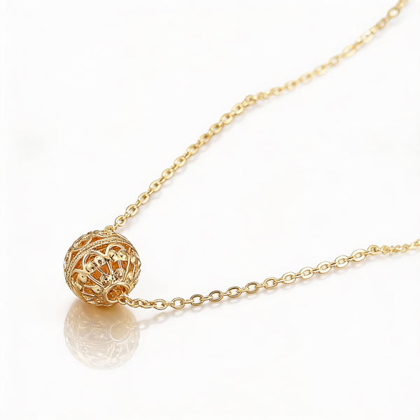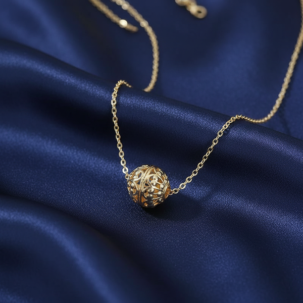 Chaque boule est finement travaillée en acier inoxydable doré, avec un filigrane délicat qui laisse passer la lumière et met en valeur la texture ajourée. Léger et élégant, ce collier se porte seul pour un style minimaliste ou en accumulation pour un look plus affirmé.