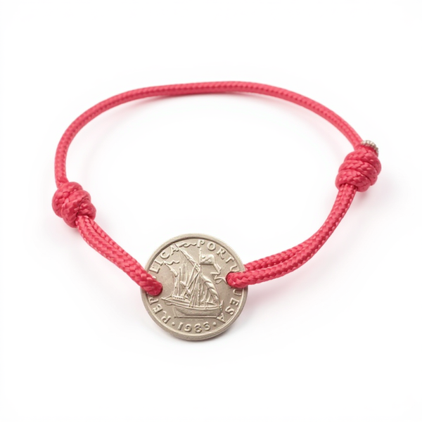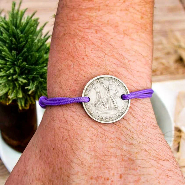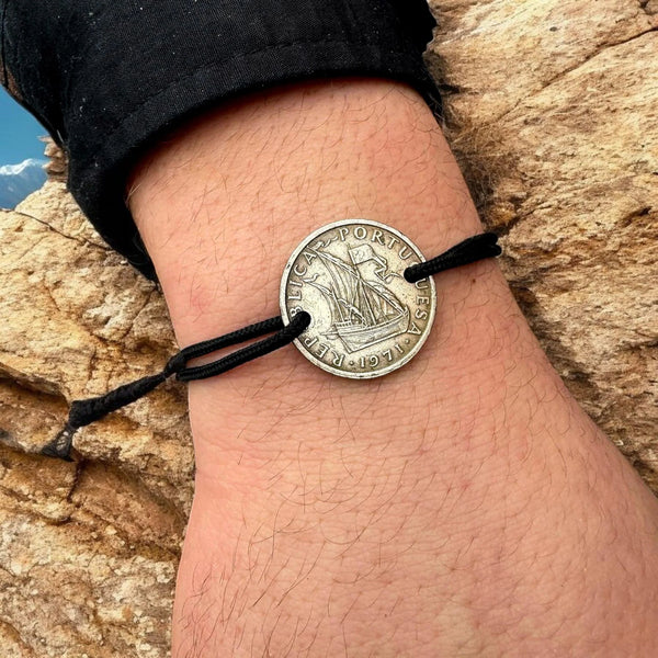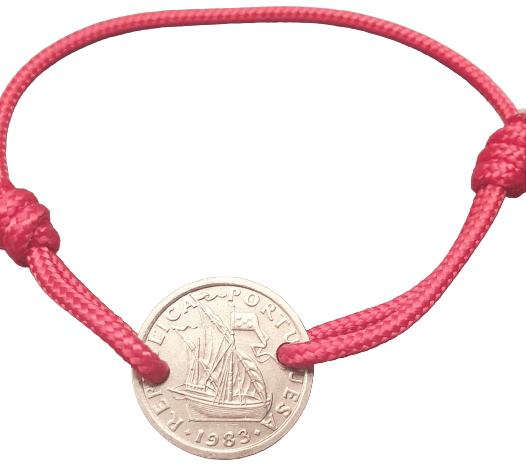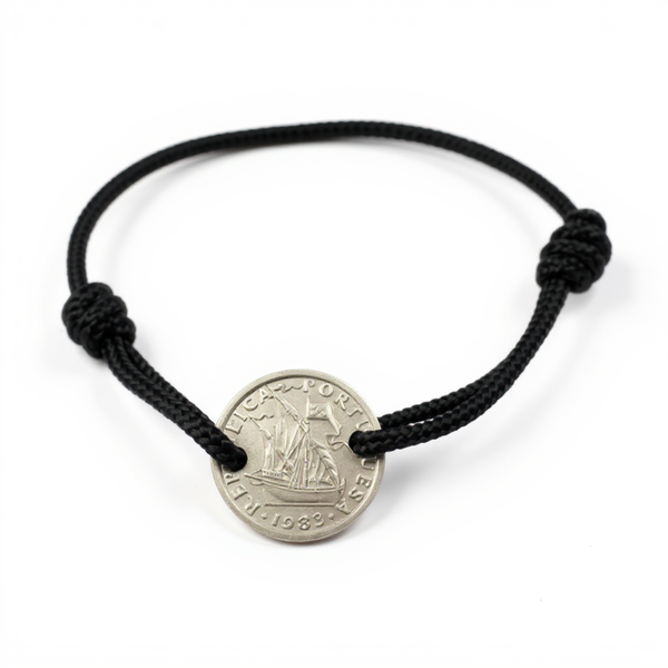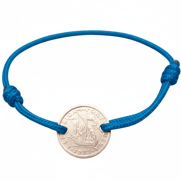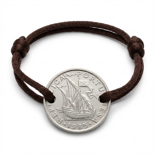 Cada pulseira é feita com uma genuína moeda de 2,5 escudos portugueses. Feitas sob encomenda, todas as criações são modelos únicos e personalizados.