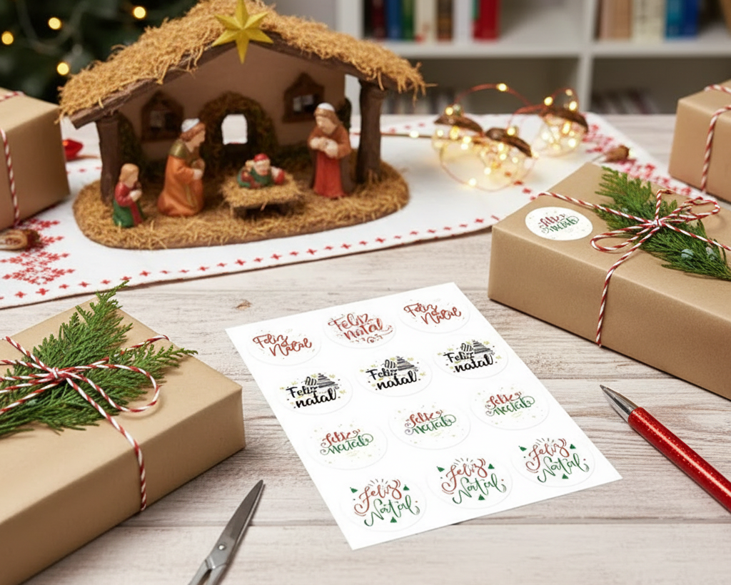 Transformez vos cadeaux et correspondances de Noël avec ces magnifiques planches de 24 stickers "Feliz Natal" ! Chaque autocollant mesure 3,8 cm de diamètre et arbore une finition douce et élégante qui ravira les yeux. Avec 4 visuels différents à découvrir, vous aurez de quoi personnaliser vos emballages avec style et fantaisie. La touche festive parfaite pour égayer vos créations de fin d'année !
