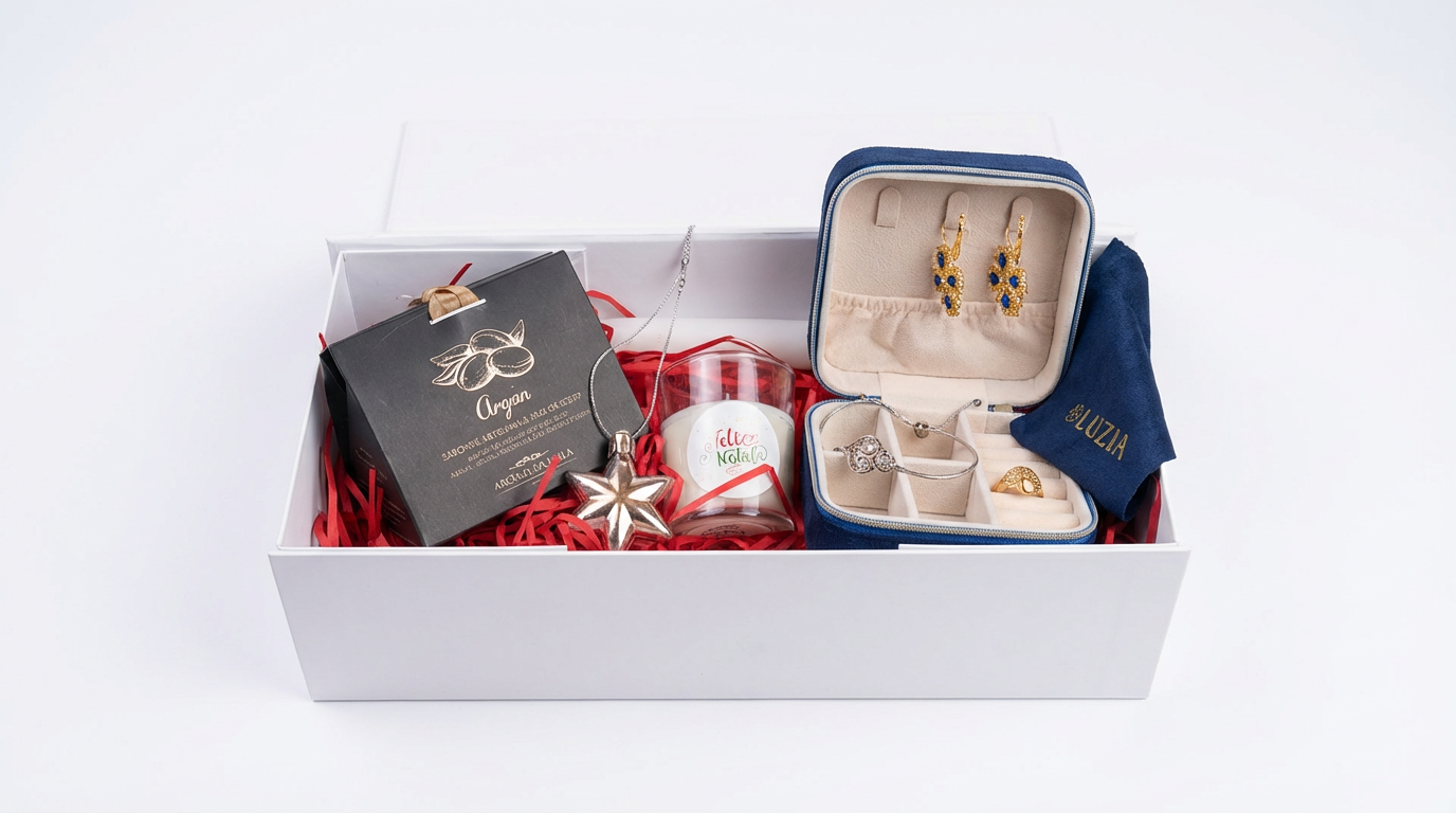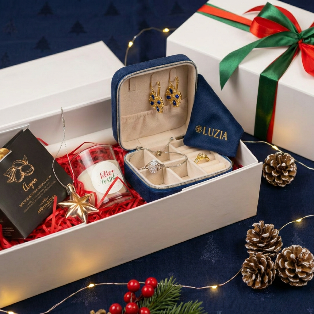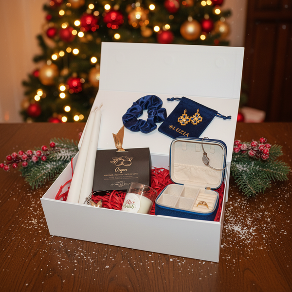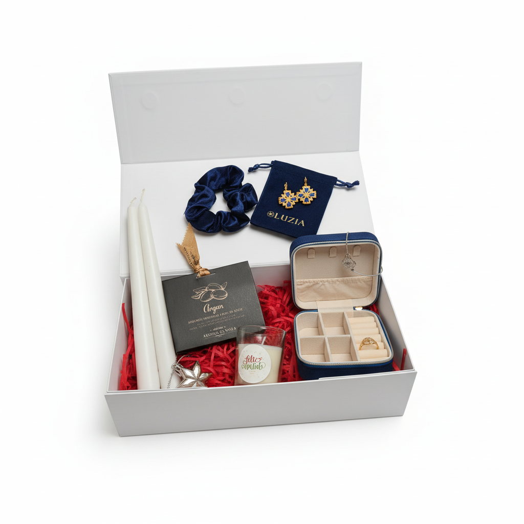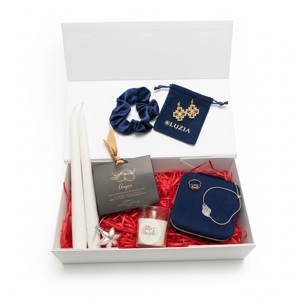 Offrez un concentré de tradition, de raffinement et de douceur avec notre Coffret Cadeau Noël Luzia, une sélection exclusive de produits portugais et de bijoux en acier inoxydable. Un cadeau premium, clé en main, présenté dans une boîte blanche rigide à rabat aimanté, parfait pour faire plaisir avec élégance.