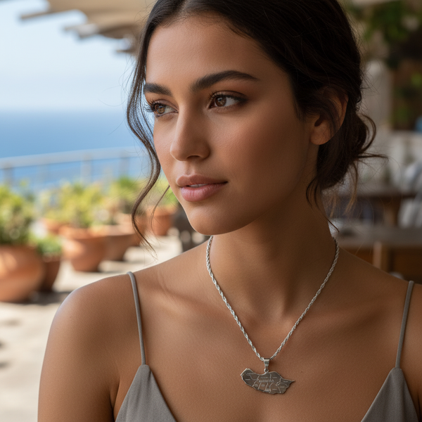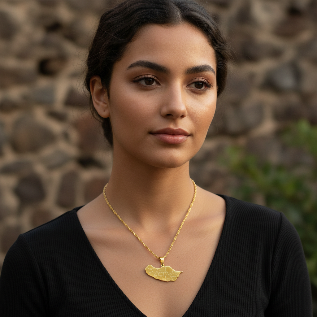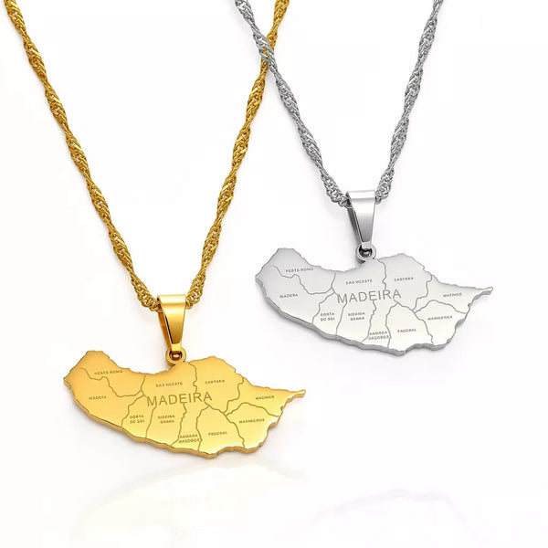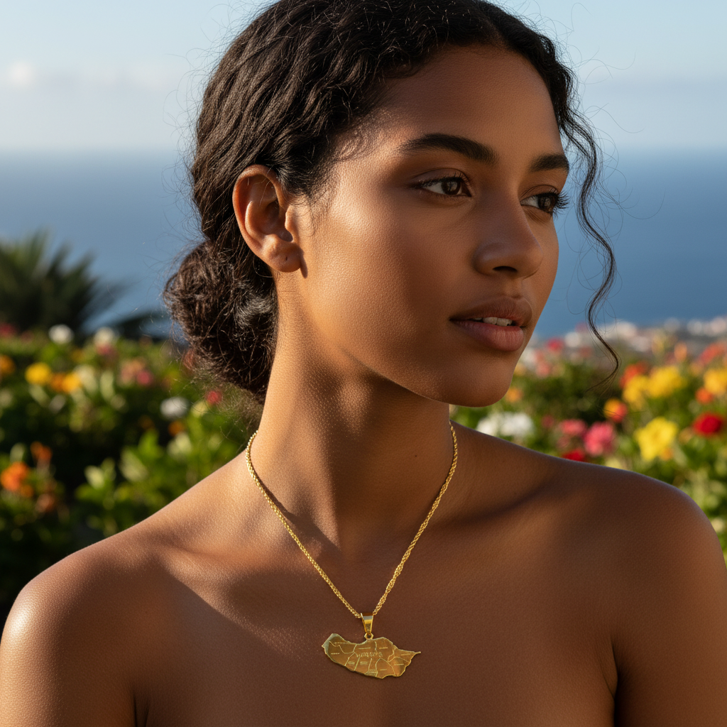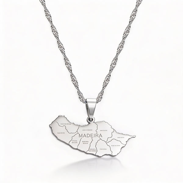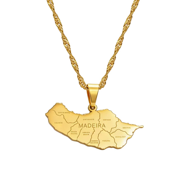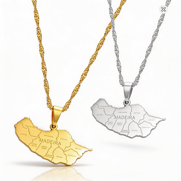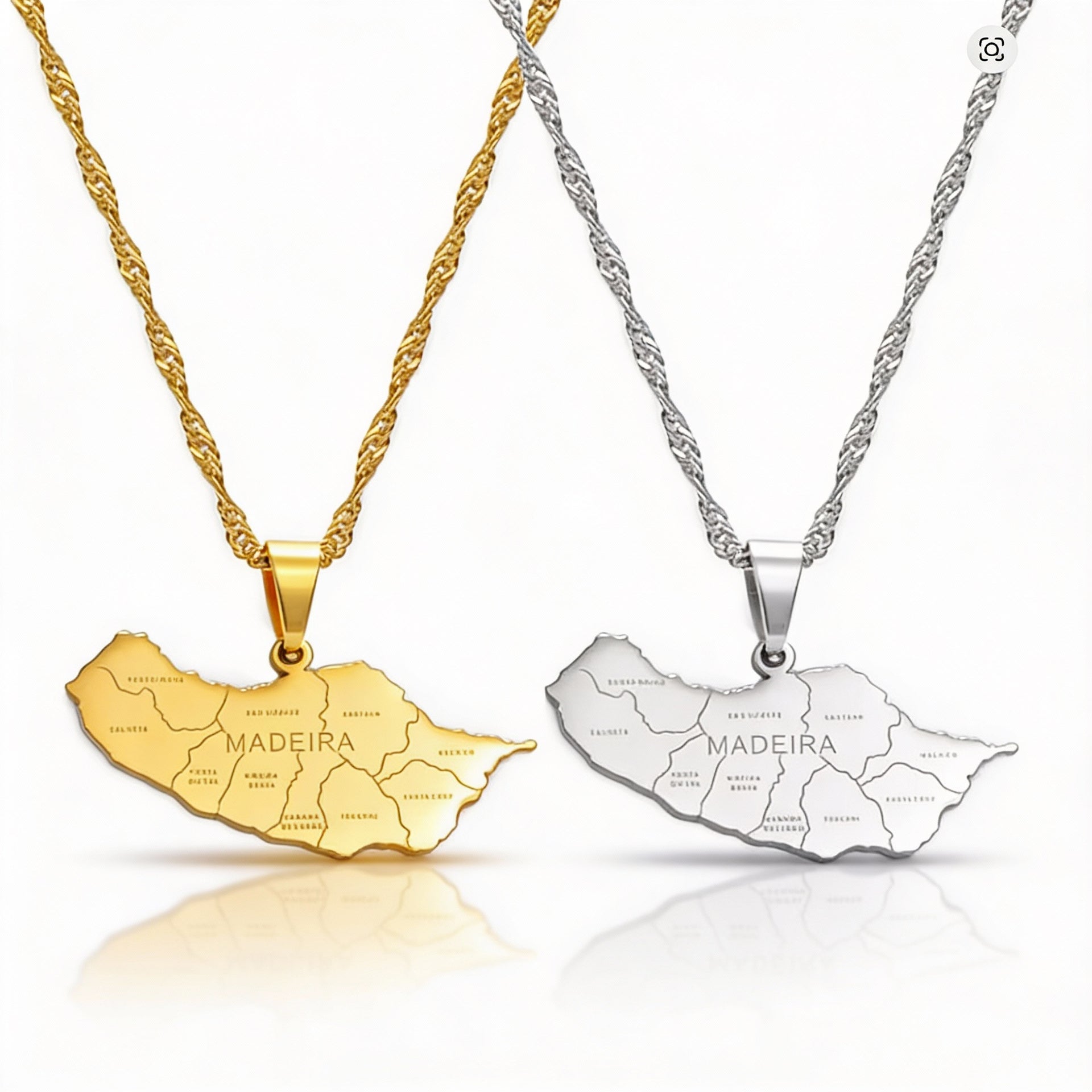 Affichez votre attachement à Madère avec ce pendentif carte de l’île, un bijou symbolique et intemporel qui célèbre le voyage, les racines et l’élégance.