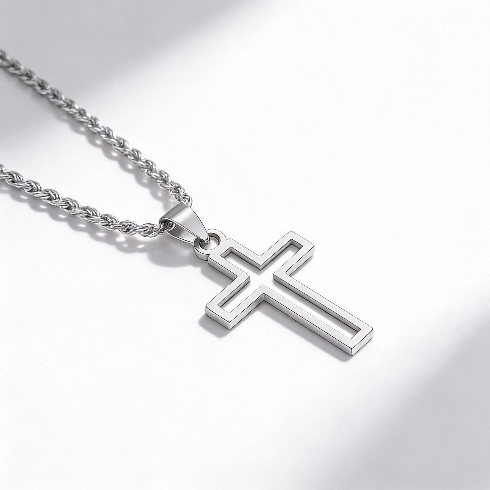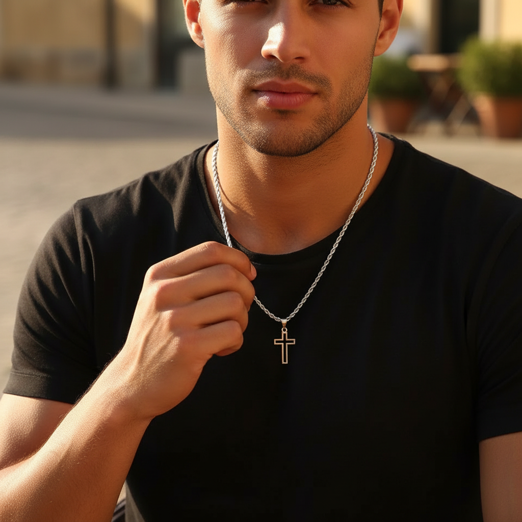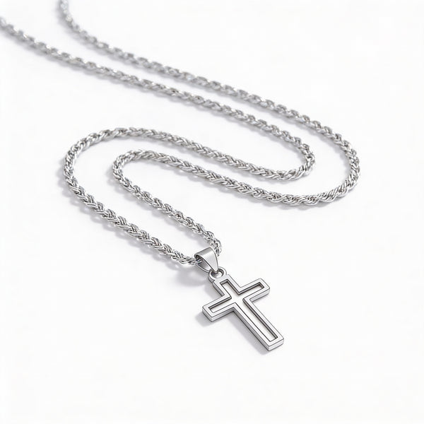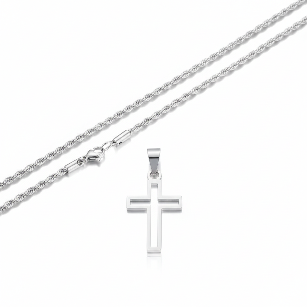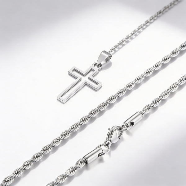 Il est accompagné d’une chaîne rope (chaîne torsadée) de 50 cm, reconnue pour sa solidité et son éclat raffiné. Conçu en acier inoxydable argenté, l’ensemble offre une excellente résistance à l’usure et une brillance durable, idéal pour un port quotidien.